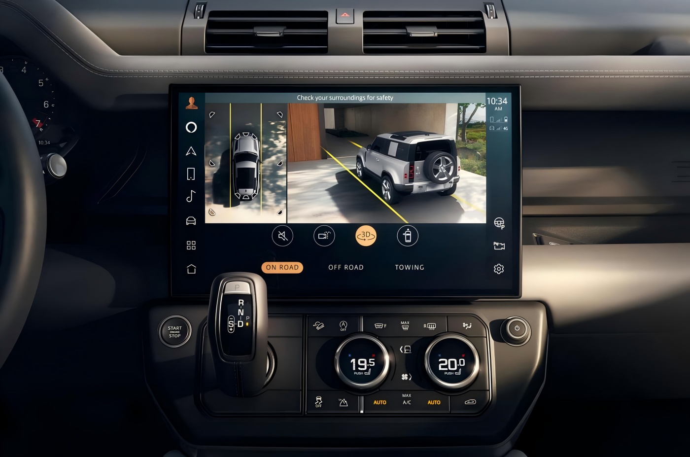 Interiör. När det gäller interiören har den totala layouten för det nya fordonet inte förändrats mycket. Den levereras fortfarande med en full flytande kristallinstrumentpanel och en tre-tals multifunktionell ratt. Multimedia -skärmen i mitten av mittkonsolen har uppgraderats från 11,4 tum till 13,1 tum. Samtidigt har det nya fordonet lagt till ett förarövervakningssystem. Detta övervakningssystem överensstämmer med EU GSR2 -förordningarna. Om föraren upptäcks och inte uppmärksammar vägen framöver kommer den att utlösa ljud- och videoralarm. Förarassistansen kan dock ställas in på inaktiverade i alternativen på mittkonsolskärmen. Dessutom erbjuds Land Rover adaptiva terrängkontrollsystem också för första gången på Land Rover Defender som en valfri funktion.